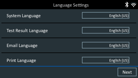 1. Upon initial power-up, the Language Settings screen is displayed on the screen. Tap Next to continue.