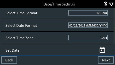 5. The Date/Time Settings are displayed. Tap Next to continue after making any adjustments.