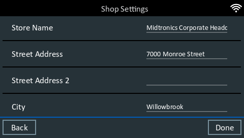 Use the onscreen keypad to enter the store name, address, and phone number. Tap Next to continue.