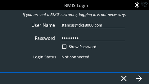 Tap Yes to connect the analyzer to an existing BMIS account. Enter a BMIS User Name and Password for the analyzer to use when transmitting test data to the BMIS database.